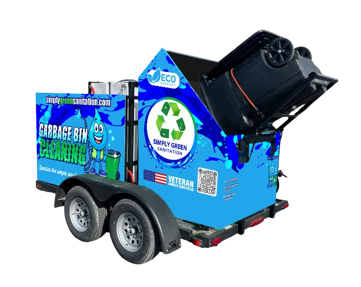 Our specialized trailer is custom made to clean garbage cans blasting them with 200° water through spray heads that reach every inch of your can. In just a few minutes, your garbage can is stink free and squeaky clean.